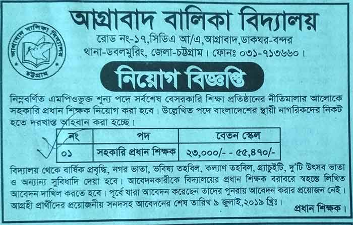 আগ্রাবাদ বালিকা বিদ্যালয়, চট্টগ্রাম এমপিওভুক্ত শূন্যপদে সর্বশেষ বেসরকারি শিক্ষা প্রতিষ্ঠানের নীতিমালা অনুযায়ী সহকারী প্রধান শিক্ষক নিয়োগের বিজ্ঞপ্তি প্রকাশ করেছে।