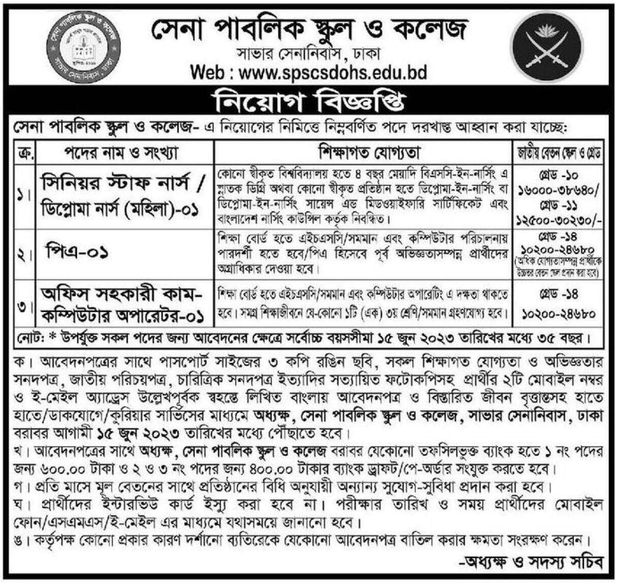 সেনা পাবলিক স্কুল এবং কলেজ বিভিন্ন বিভাগে শিক্ষক নিয়োগের জন্য যোগ্য প্রার্থীদের কাছ থেকে দরখাস্ত আহবান করা হয়েছে।